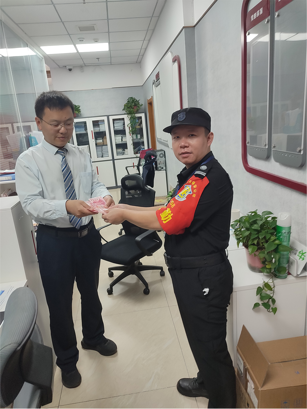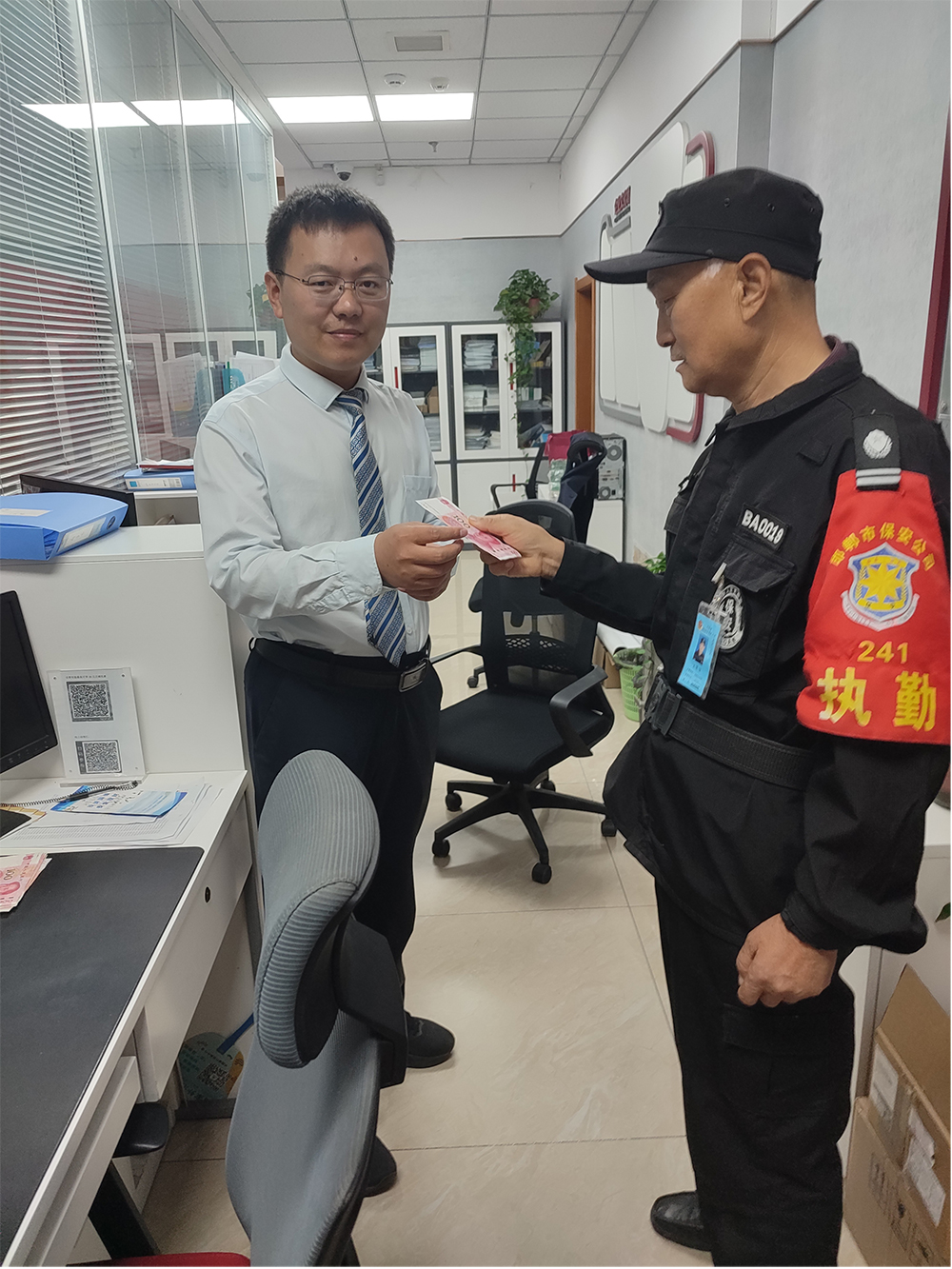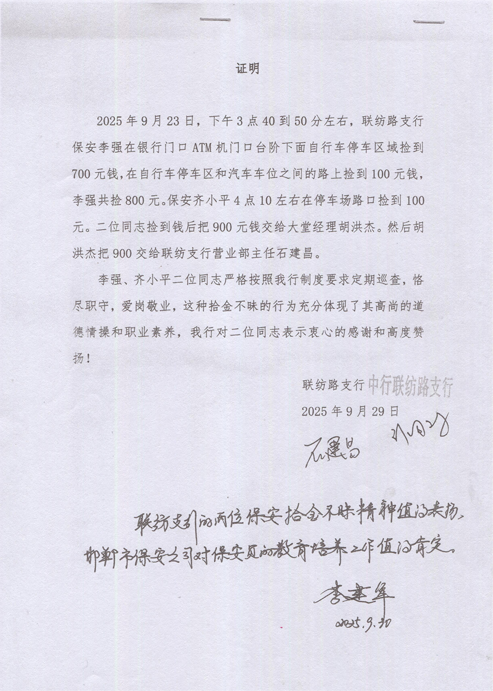 2025年9月23日下午,我公司保安員李強(qiáng)與齊小平在中國銀行聯(lián)紡路支行慣例執(zhí)勤時(shí),先后在營業(yè)網(wǎng)點(diǎn)外圍區(qū)域撿到鈔票現(xiàn)金共計(jì)900元后立即上報(bào)并全部上交至客戶銀行相關(guān)部門。